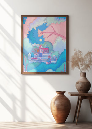 Girl With Her Cat Under A Moonlit Sky
